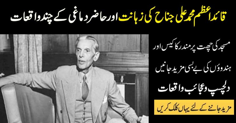 آپ نے مسجد کے لیے سطح زمین سے 18 فٹ اونچائی تک تعمیر کیلئے زمین خریدی ہے آپ ایسا کریں مسجد کی چھت 17 فٹ سطح زمیں سے اوپر رکھیں اور ایک فٹ چھوڑ دیں جس دن ہندو اپنے مندر کی تعمیر کے لئے کنکریٹ لائیں تو آپ مجھے طلب کر لیجئے گا مسلمانوں نے ویسا ہی کیا جو قائد اعظم محمد علی جناح رحمتہ اللہ علیہ نے فرمایا تھا سطح زمین 18 فٹ اونچی خریدی گئی جگہ میں صرف 17 فٹ اونچی چھت تعمیرکی گئی اور ایک فٹ اونچائی چھوڑ دی گئی ہندو بہت خوش ہوئے کہ مسلمانوں نے یہ جانتے ہوئے کہ ہم اوپر مندر کی تعمیر کریں گے اس کے باوجود مسجد تعمیر کر لی لہذا انہوں نے مندرکی تعمیرکے لیے کنکریٹ اکٹھا کرنا شروع کردیا مال اکٹھا کرنے کے بعد تعمیرات کے لیے مستری اور مزدورں کا بندوبست کیا گیا تو مسلمانوں نے قائد اعظم محمد علی جناح کو تعمیرات کے موقع پر بلا لیا قائداعظم نے مکمل تحقیق کرنے کے بعد ہندوؤں سے پوچھا کہ آپ نے سطح زمین سے 18 فٹ سے اوپر کا حصہ مندر کے لئے خرید رکھا ہےسارے ہندو طنز و مزاح میں ہاں ہاں کرنے لگے تو قائد اعظم رحمت اللہ علیہ نے اپنی زبردست زہانت سے فرمایا مسلمانوں نے بھی اپنے حصے کی جگہ مکمل تعمیر نہیں کی ہے ان میں سے ایک ہندو چونکا اور کہا وہ کیسے تو قائد اعظم محمد علی جناح رحمتہ اللہ علیہ نے فرمایا مسلمانوں نے مسجد کی اونچائی 18 ف